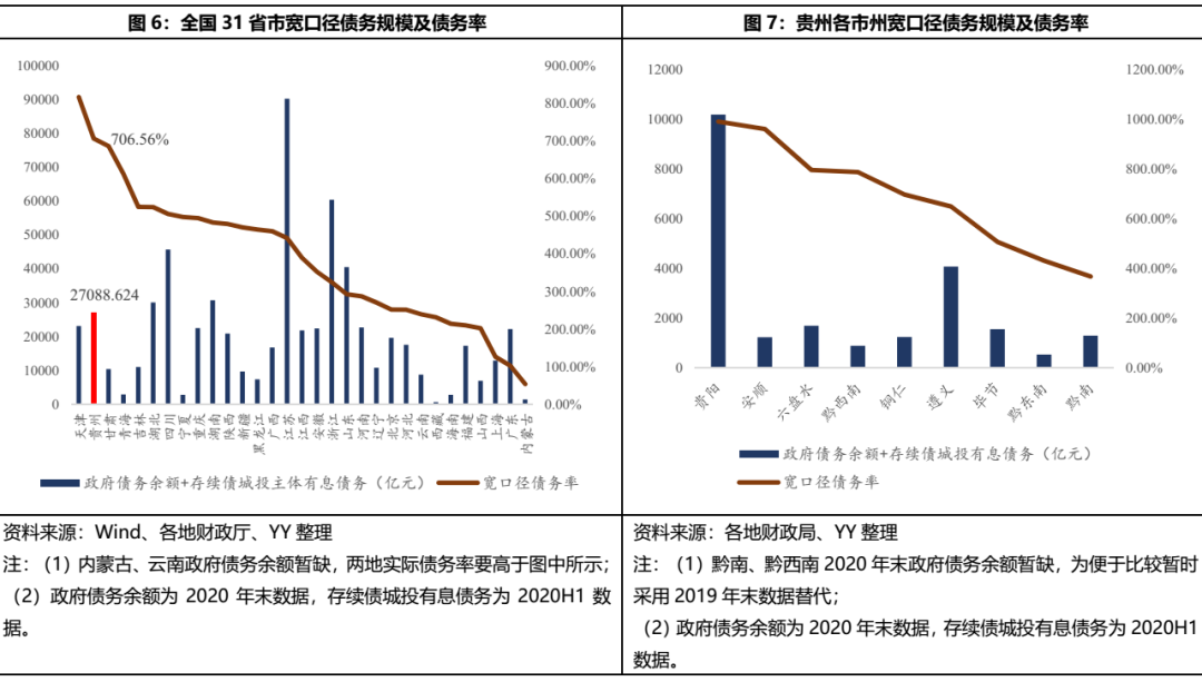 貴州債務問題可謂老生常談,由于經濟基礎較弱且常年大興基建,貴州省整體債務水平較重,政府顯隱性債務之和遠高于經濟水平相近的廣西、山西等省份。采用(政府債務余額+存續債城投主體有息債務)/(一般公共預算收入+政府性基金收入)來衡量寬口徑債務率,貴州省達706.56%,在全國31個省市中排名第二。