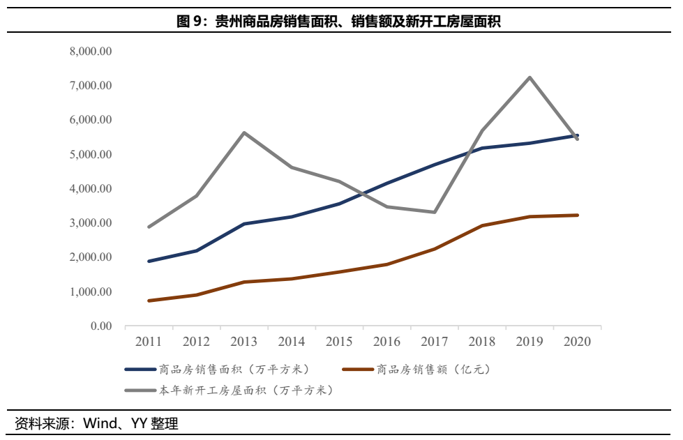 2020年,貴州省商品房銷售面積5,552.51萬平方米,同比增長4.3%,增速高于全國(2.6%)和西部地區(2.6%)平均水平1.7個百分點,其中住宅銷售面積4,929.93萬平方米,增長6.9%;商品房銷售額3,224.23億元,同比增長1.3%,其中住宅銷售額2,760.73億元,增長9.2%。從銷售終端來看,去年貴州房地產市場運行較為平穩。