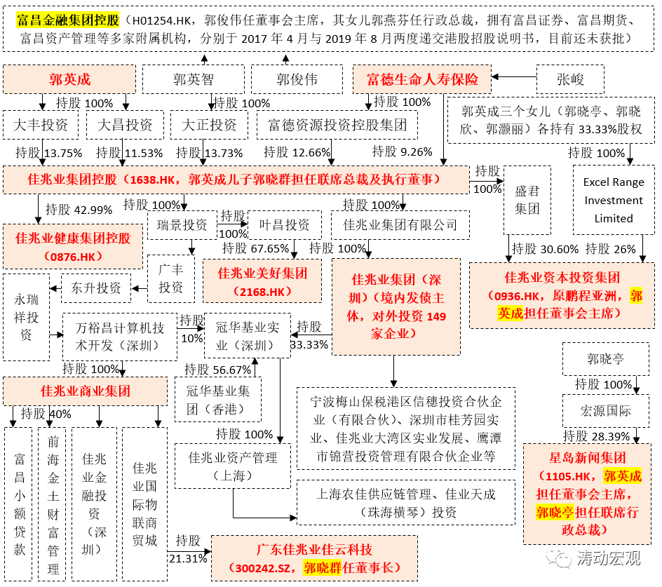 2、這六家上市主體的一把手基本均由郭氏家族擔任,如郭英成分別擔任佳兆業集團控股、佳兆業資本投資集團的董事會主席、星島新聞集團的法定代表人和董事會主席,而郭英成的三個子女郭曉群、郭曉欣、郭曉亭也在六家上市主體中擔任要職。