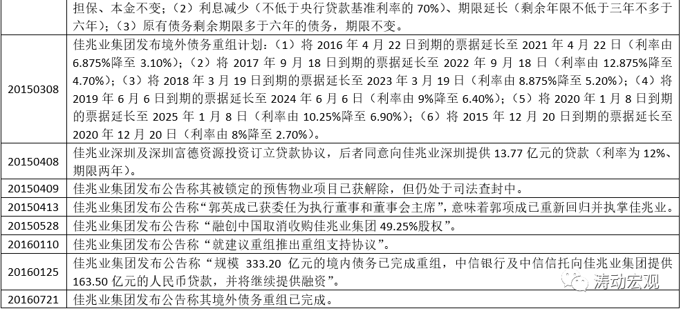 (3)2015年1月佳兆業集團1月觸發了匯豐銀行貸款的違約事項,可能導致一系列債務的交叉違約條款,為此2015年2月開始佳兆業開啟債務重組進程。當時債務重組涉及境內外債務合計650.09億元,其中境內債務合計497.70億元。