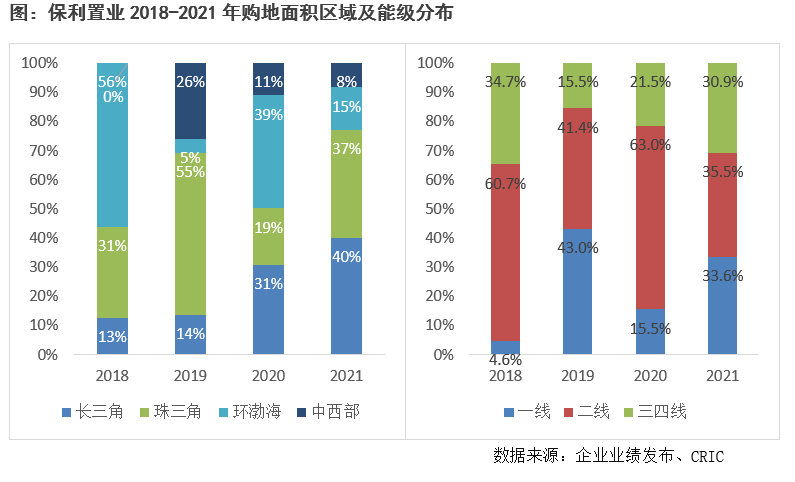 在城市能級方面,保利置業近兩年加大在三四線城市的布局,占比自2019年以來連年攀升,2021年占比達到30.9%,同比增長9.4個百分點,同時也加大在一線城市的布局,2021年一線城市的占比達到33.6%,同比上升18.1個百分點。而在區域布局方面,保利置業于長三角和珠三角區域拿地的建面占比最高,分別達到40%和37%,占比分別同比增長了9個百分點和18個百分點。