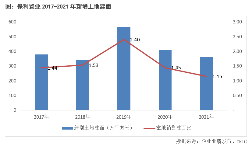 【拿地積極,聚焦長三角和珠三角區域】全年新增土地建面360.9萬平方米,權益拿地總價230億元。自2017年以來新增土地建面高于銷售建面,2021年達到1.15,拿地較為積極。在區域布局方面,保利置業于長三角和珠三角區域拿地的建面占比最高,分別達到40%和37%。