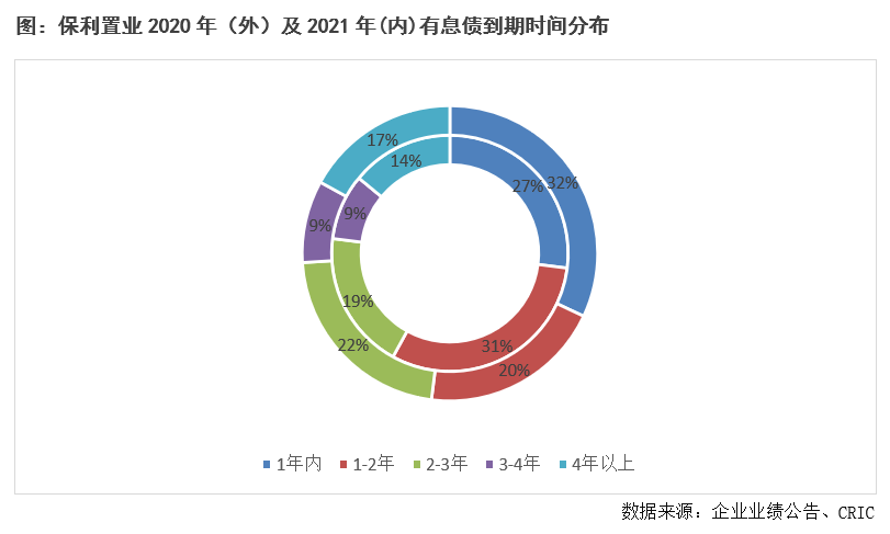 2021年末,保利置業持有現金較同比下降16.15%至366.02億港元,非受限現金短債比1.56,而2020年為1.53,現金短債比進一步改善,短期償債壓力不大。而從債務期限來看,保利置業短債占比下降5個百分點至27%,債務結構得到改善。