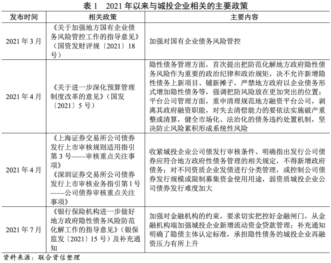 2021年以來,國發〔2021〕5號文、滬深交易所公司債發行上市審核指引、銀保監發〔2021〕15號文及補充通知等政策相繼出臺,對地方政府隱性債務保持高壓監管態勢,城投企業融資政策整體收緊。