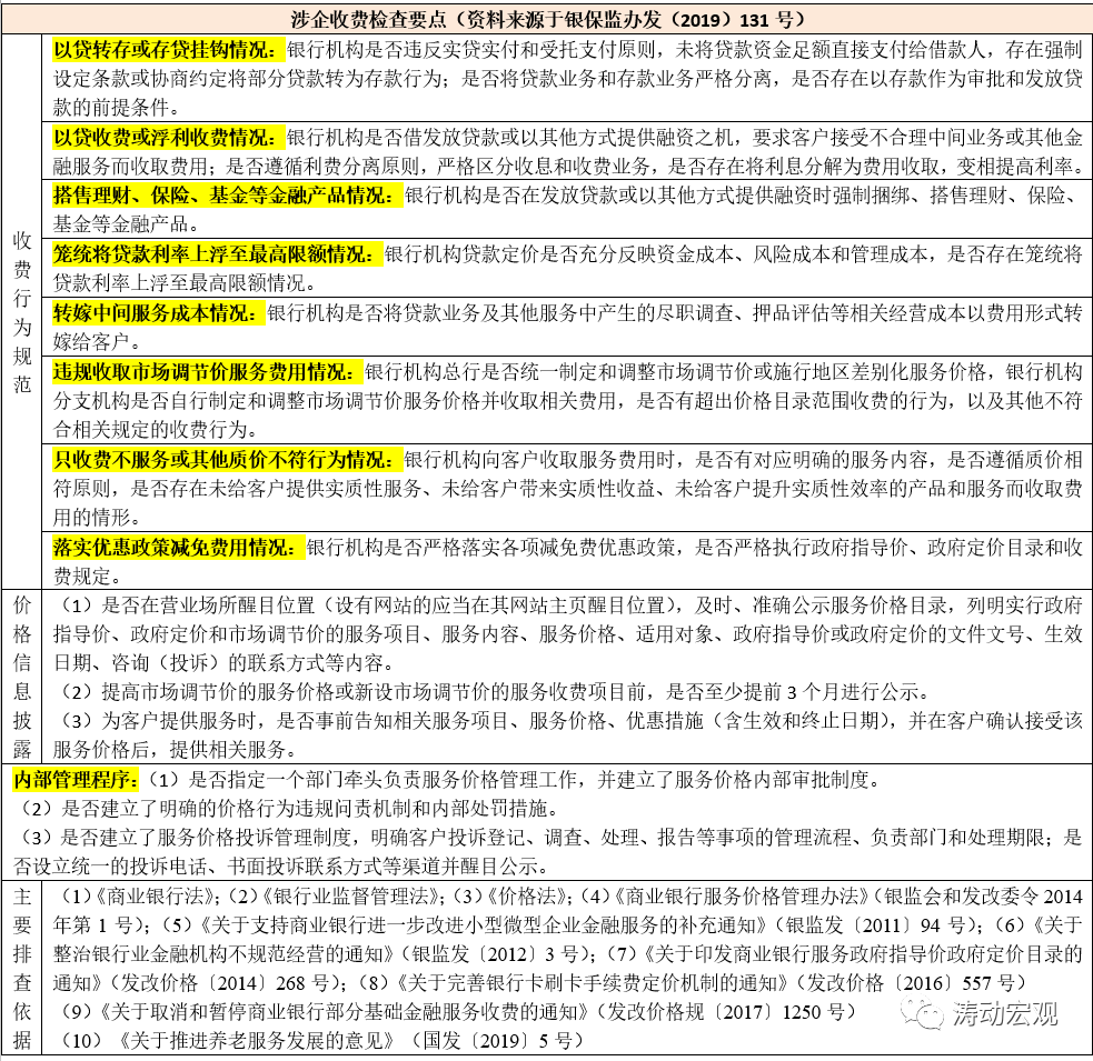 2019年5月27日,銀監(jiān)會(huì)發(fā)布《關(guān)于開展銀行違規(guī)涉企服務(wù)收費(fèi)專項(xiàng)治理工作的通知》(銀保監(jiān)辦發(fā)(2019)131號(hào)),明確提出相關(guān)檢查要求與制度依據(jù),具體可見下表,這里不再贅述。