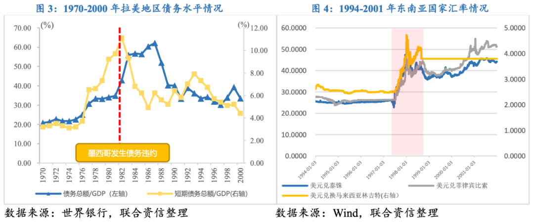 美聯儲收緊貨幣政策會增大債務危機以及金融危機爆發的可能性。20世紀70年代,美聯儲加息誘發了拉美債務危機。在兩次石油危機爆發的背景下,美聯儲貨幣政策由寬松轉為緊縮帶動短期Libor走高,導致拉美國家利息償付壓力大幅提高;同時,美元走強帶動國際資金流動方向逆轉,導致拉美國家國際收支入不敷出以及外匯儲備縮水,對外債的償付能力大幅削弱,1982年墨西哥短期外債水平接近12%(見圖3),爆發債務危機并傳導至拉美地區。1995年,美聯儲加息誘發了東南亞金融危機。美聯儲重回加息周期使美元幣值逐步走高,導致大量短期資本撤離亞洲資本市場,刺破了東南亞等國的股市泡沫和地產泡沫,在經濟面大幅下滑的背景下各國幣值高估問題愈加明顯,迫使泰國等改固定匯率為浮動匯率,進一步加劇其本幣匯率貶值(見圖4),最終導致東南亞地區股匯雙殺,并進一步演化為區域性金融危機。2008年,美聯儲加息誘發了美國次貸危機。2003-2006年美聯儲連續17次上調聯邦基金利率425個BP,連續而密集的利率抬升成為刺破房地產和資本市場泡沫的重要導因。此外,利率快速上揚導致信用緊縮,不僅抑制了居民消費還使居民住房抵押償付實力承壓,次級貸款抵押風險向房地產以及金融衍生品市場傳導,最終次債危機逐步傳導至金融危機,再由金融領域傳導至各行業實體領域并發展成經濟危機。