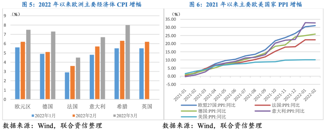 本輪通脹壓力受到貨幣流動性過剩與供需結構性失衡的雙重影響。一方面,新冠疫情暴發后各國積極救市,釋放出空前流動性并造成全球貨幣超發,僅2020年全球流通中的廣義貨幣就增加了12.7萬億美元,再疊加貨幣乘數效應,估計全球釋放的流動性增加了超過100萬億美元,流動性過剩推升全球通脹壓力走高。另一方面,本輪通脹壓力還受到供需失衡的結構性因素影響。新冠疫情暴發初期受隔離政策影響,需求端斷崖式萎縮;隨著疫情得到一定控制,被壓抑的需求得到釋放,但受全球供應鏈斷裂以及基礎能源價格上漲等因素影響,供給端生產動力不足,供求失衡帶動基礎物價上漲。尤其是俄烏戰爭沖突爆發,對全球大宗商品價格以及主要供應鏈均造成顯著沖擊,進一步帶動全球通脹壓力走高。歐元區3月消費者價格指數(CPI)同比上漲7.5%,較2月上漲2個百分點,其中能源產品價格同比上漲44.7%,是推動該地區通脹上升的最主要推手。分國別來看,德國、法國、意大利和希臘的CPI分別升至7.3%、4.5%、6.7%和8.0%(見圖5),分別創自1981年、1997年、1991年和1994年以來新高。