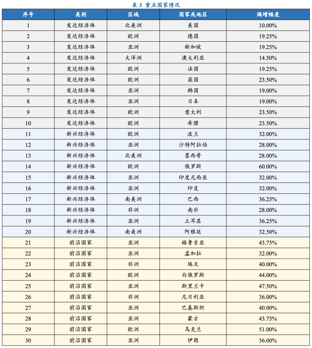 利用專家意見對美聯儲加息、俄烏戰爭沖突以及通脹壓力走高三種熵增場景進行評價,并以此為基礎判斷計算重點國家的熵增程度,搭建后疫情時代下的各國秩序分布。同時,與舊格局進行比較,找出其中跨區域風險變動的國家。