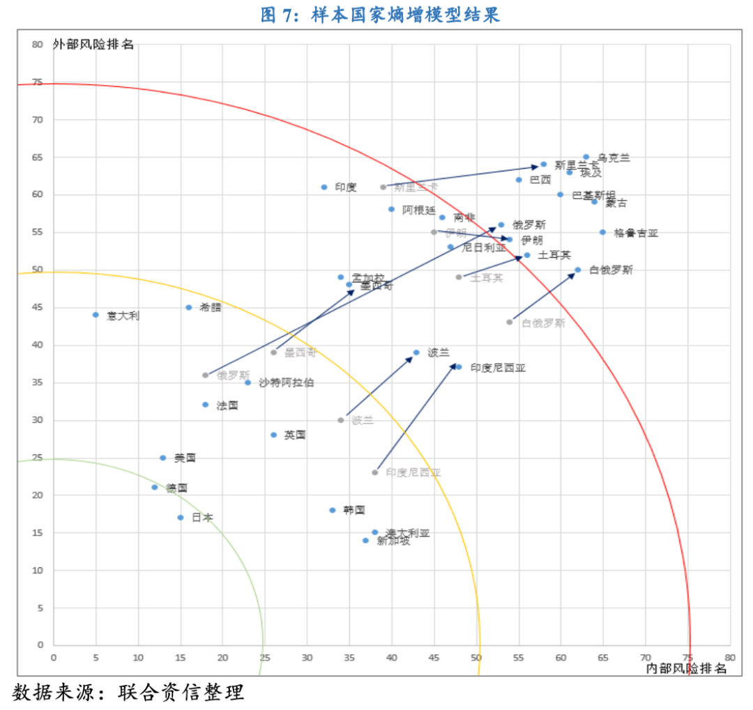 從新興經濟體樣本看,新興經濟體受熵增風險影響較大,其中俄羅斯受歐美制裁加碼影響,預計將由低風險區域跌入高風險區域;墨西哥和印度尼西亞受美聯儲加息及物價上漲影響,預計將由低風險區域跌入中風險區域;土耳其受熵增風險影響較大,預計將由中風險區域跌至高風險區域。