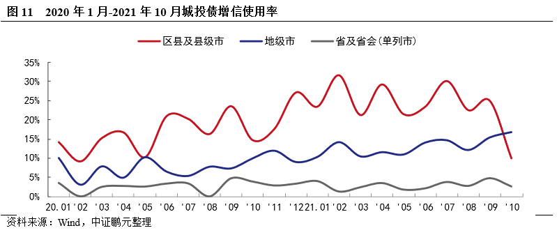 2021年10月份,城投債總體增信使用率為11.0%,較上月下降5.13個百分點(diǎn)。從行政級別上來看,區(qū)縣級平臺、地級市平臺和省級平臺的增信使用率分別為10.0%、16.8%、2.6%,較上月分別下降14.9個百分點(diǎn)、上升1.4個百分點(diǎn)和下降2.2個百分點(diǎn)。因區(qū)縣級平臺發(fā)行難度上升,該級發(fā)債主體的大幅下使增信使用率也隨之下降,而地級市平臺的增信使用率仍保持上升趨勢,市場對城投的風(fēng)險偏好降低。