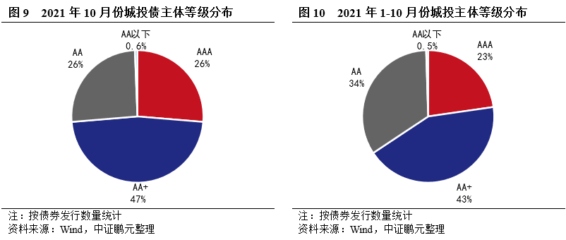 主體評級中樞上升,AAA級主體占比上升較大。10月份城投債主體評級AA+級及以上級別合計(jì)占比73.7%,較上月上升11.0個百分點(diǎn),其中AAA級主體占比較上月上升6.7個百分點(diǎn)。