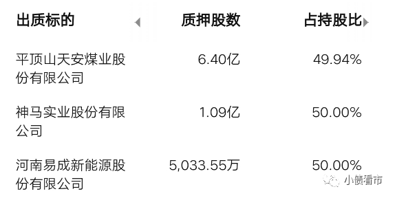 在股權質押方面,平煤神馬分別質押平煤股份、神馬股份和易成新能6.4億股、1.09億股以及5033萬股,占其所持股份比例的49.94%、50%和50%,可以看出其股權質押率較高。