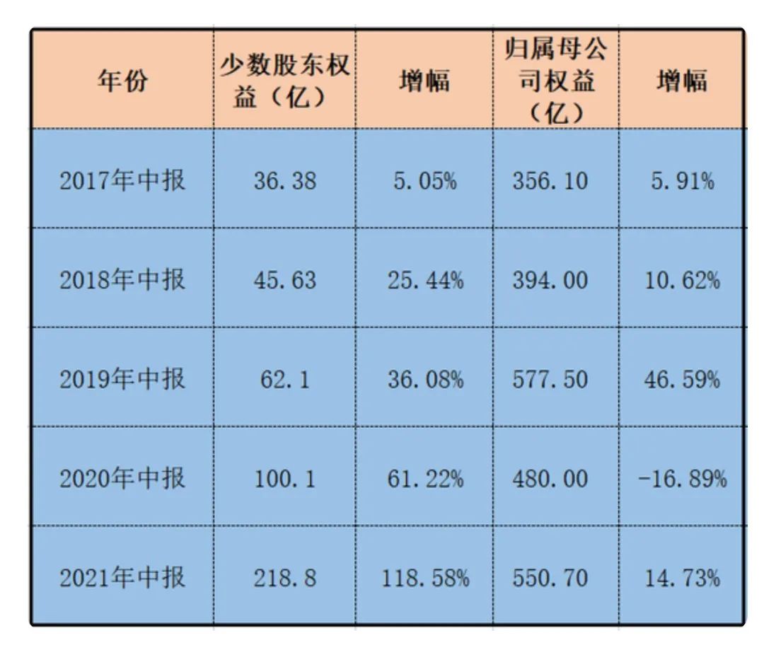 2017年到今年上半年,雅居樂(lè)的少數(shù)股東權(quán)益一路飆增,分別達(dá)到23.1億、54.1億、73.0億、125.2億、218.83億。