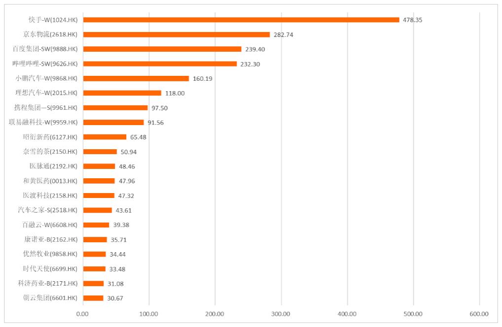 超過百億規模的共有6家企業,分別為快手(1024.HK)、京東物流(2618.HK)、百度集團、嗶哩嗶哩、小鵬汽車、理想汽車,其中快手以478.35億港元的募資額高居榜首。而京東物流是國內最大的供應鏈物流巨頭,也是繼京東、達達集團、京東健康后,京東系的第四個IPO。小鵬和理想作為國內領先的智能汽車企業,赴港上市進一步彌補了港股市場的科技股的短缺。