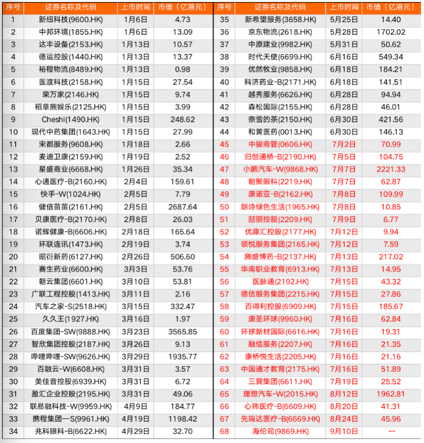 今年以來,快手(1024.HK)、百度(9888.HK)、嗶哩嗶哩(9626.HK)、小鵬(9868.HK)、理想(2015.HK)、攜程(9961.HK)等均在港股上市,第四范式(1590.HK)、商湯集團(1600.HK)、有贊科技(1434.HK)等陸續在港交所交表。