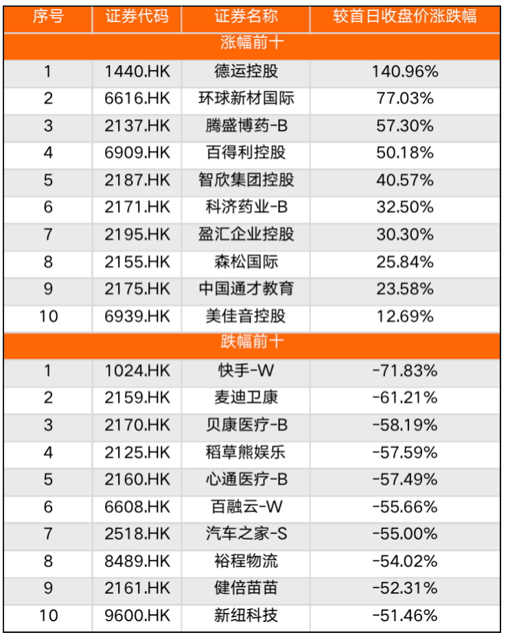表2 2021港股上市的中國企業漲跌幅前十名
