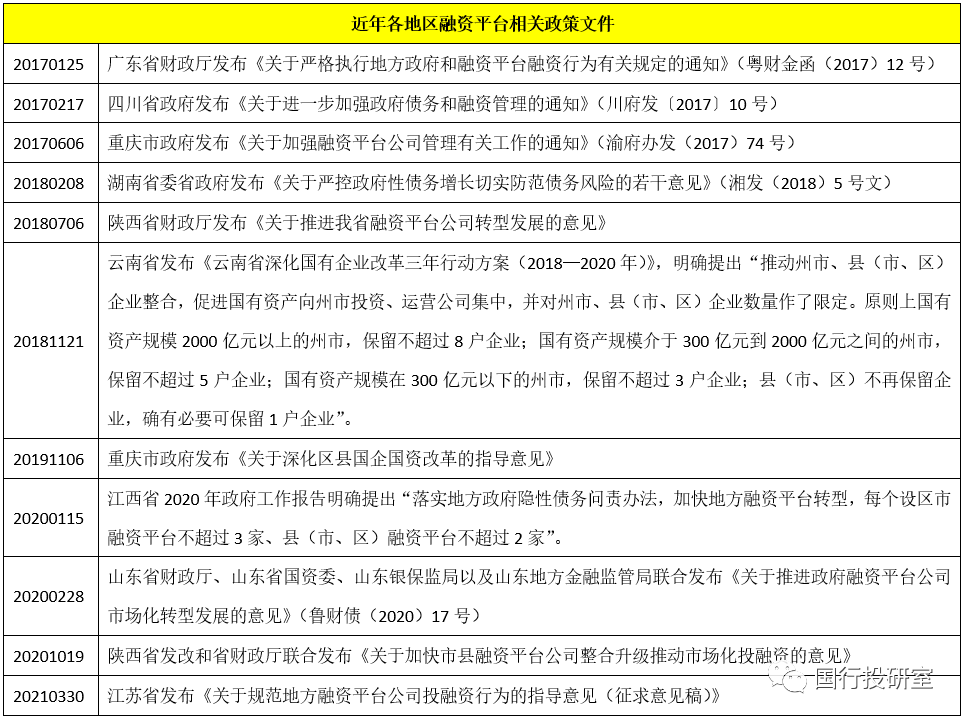 重慶也有兩份政策文件,分別為2017年6月6日和2019年11月6日重慶市政府發布的《關于加強融資平臺公司管理有關工作的通知》(渝府辦發(2017)74號)和《關于深化區縣國企國資改革的指導意見》,核心要點如下: