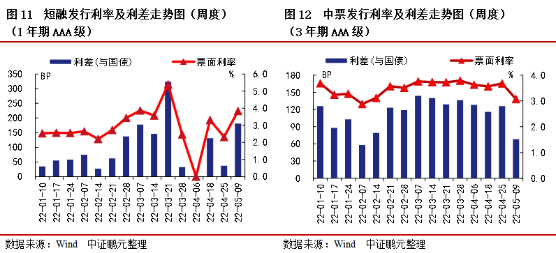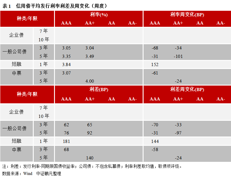 上周中票、一般公司債平均發行利率利差下行收窄,短融平均發行利率利差上行走擴;