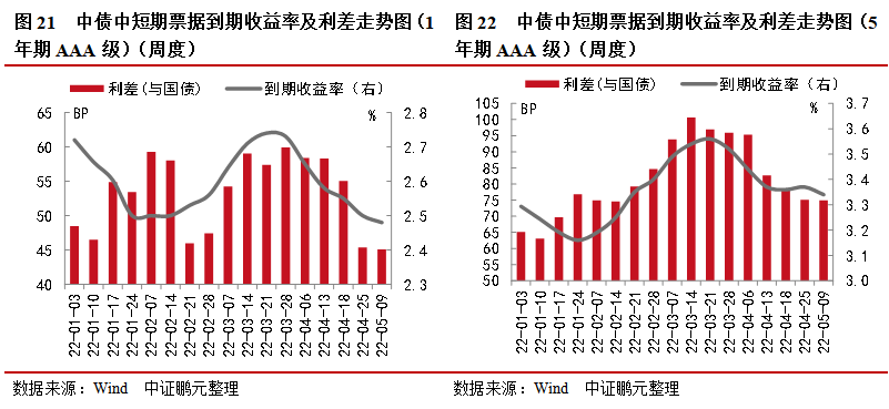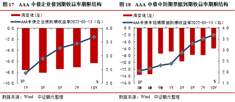 1年期AAA級別中債中短期票據上周平均到期收益率為2.48%,較前一周下行2.00BP;與同期限國債平均利差為45.11BP,較前一周收窄0.28BP。5年期AAA級別中債中短期票據上周平均到期收益率為3.34%,較前一周下行3.00BP;與同期限國債平均利差為74.95BP,較前一周收窄0.16BP。