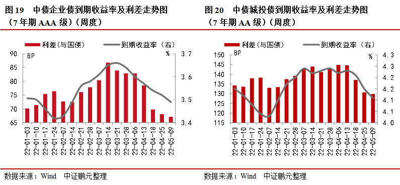 7年期AAA級別企業債上周平均到期收益率為3.49%,較前一周下行3.00BP;與同期限國債平均利差為67.15BP,較前一周收窄0.97BP。7年期AA級別城投債上周平均到期收益率為4.11%,較前一周下行4.00BP;與同期限國債平均利差為129.85BP,較前一周收窄0.82BP。