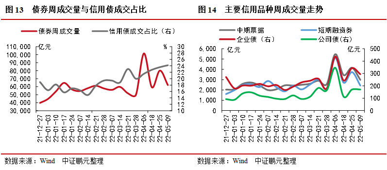 1. 債券成交量較前一周下降22.65%,信用債成交占比為24.20%,較前一周上升0.60%