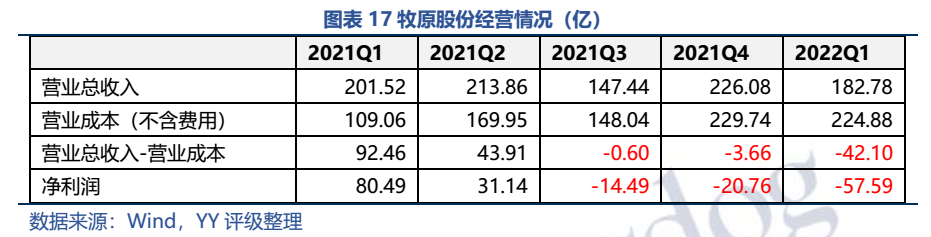 21年2月以來生豬出欄價格一路下行,21年10月最低跌至11元/千克左右,此后一直在10-15元/千克徘徊,跌破了部分企業的成本價,牧原從21年Q3開始也出現了持續虧損。
