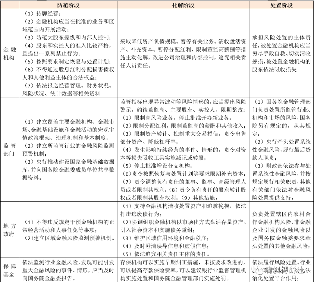 風險化解階段,金融機構、監管部門、地方政府和保障基金依法依規履行相關責任。其中,金融風險承擔風險化解的主體責任,地方政府需履行風險化解職責,監管部門和存保基金要有早期糾正和監管措施。