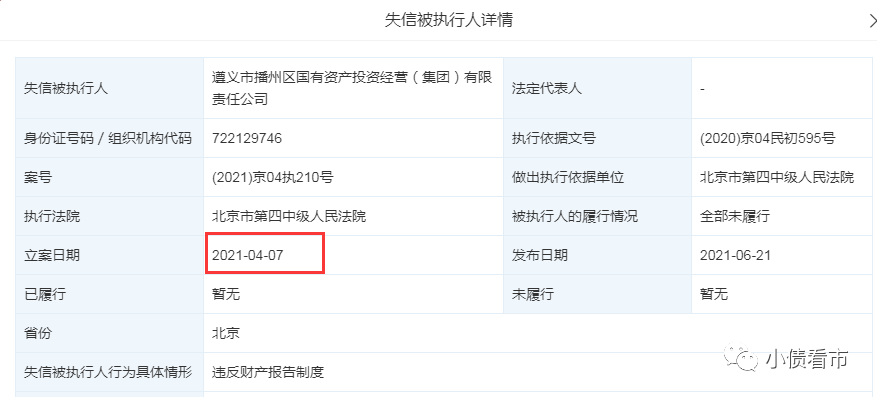 今年4月,由于與華融信托的糾紛,播州國投未履行法院裁定的給付義務,不僅被列為失信被執(zhí)行人,還被采取限制消費措施。