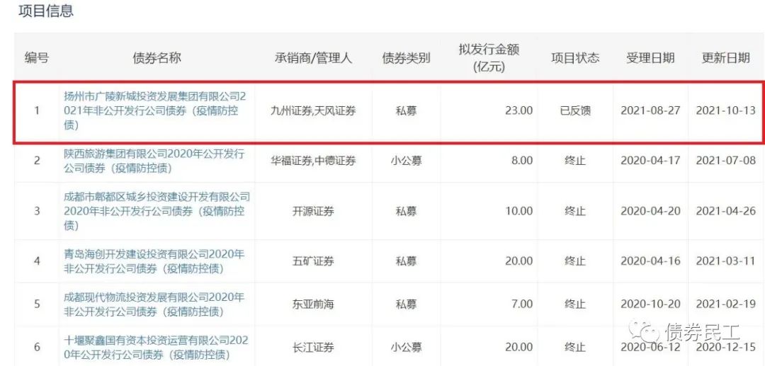 2021年至今,在深交所申報的疫情防控債只有揚州市廣陵新城投資發展集團有限公司2021年非公開發行公司債券(疫情防控債)一只債券,擬發行金額為23億元。深交所在2021年沒有核準疫情防控債的通過債券批文。