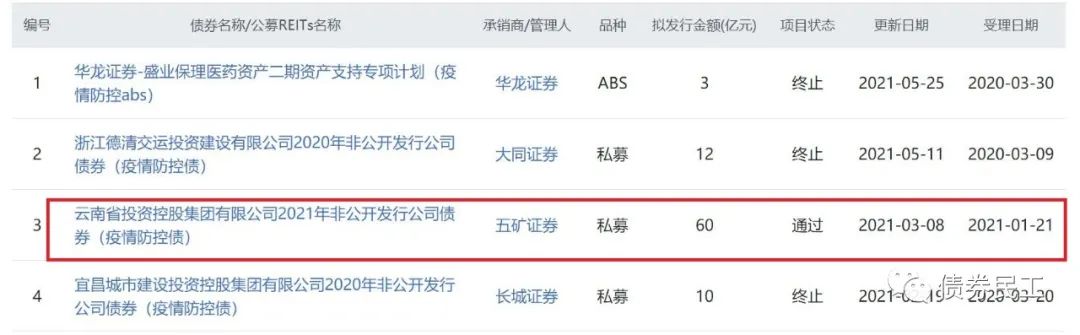 不只是在債券一級發行方面,在債券申報方面,疫情防控債也失去了吸引力。2021年至今,上交所審核通過的疫情防控債只有云南省投資控股集團有限公司2021年非公開發行公司債券(疫情防控債)一只債券,擬發行金額為60億元,其余三只債券產品和ABS產品均終止。但是上述債券批文在2021年暫未發行。