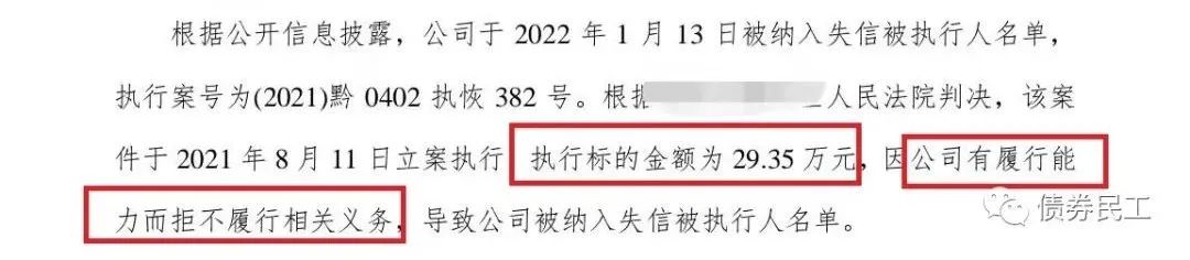 債券民工曾在某些城投公司的被執(zhí)行金額越來越低了一文中感慨,城投公司的被執(zhí)行金額越來越低,沒想到的是,某些城投公司失信被執(zhí)行人的被執(zhí)行金額也越來越低了。根據(jù)評級公司于2022年1月20日披露的公告,某城投公司因為執(zhí)行標的金額為29.35萬元的案件有履行能力而拒不履行相關義務,于2022年1月13日被納入失信被執(zhí)行人名單。