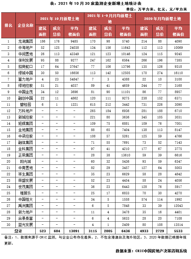 原標(biāo)題: 企業(yè)月報(bào)|百強(qiáng)10月業(yè)績與上月基本持平,典型房企拿地總額降至新低(10月)