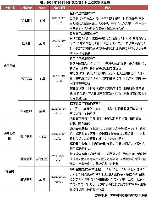 10月仍以造節(jié)為主,折扣力度平穩(wěn),部分特價(jià)房優(yōu)惠較大,時(shí)代、招商采取會(huì)員制、游戲活動(dòng)營銷以擴(kuò)大用戶基數(shù),增強(qiáng)用戶粘性。從營銷方式來看,本月房企營銷仍然以造節(jié)營銷為主,活動(dòng)形式大同小異,優(yōu)惠讓利也比較平穩(wěn),少數(shù)地區(qū)特價(jià)房力度較大,像融信成渝地區(qū)準(zhǔn)現(xiàn)房最高折扣可達(dá)75折。另外需要關(guān)注的是,本月時(shí)代中國推出了灣區(qū)大會(huì)員卡、超級(jí)業(yè)主金卡等活動(dòng),9.9元享折扣,可抽取iphone13等獎(jiǎng)品,而招商蛇口“王牌購房節(jié)”則需要客戶完成任務(wù),參與小游戲來賺取能量石,才能參與抽獎(jiǎng),獲得折扣,兩種活動(dòng)雖然形式不同,但是基于客戶運(yùn)營思維,擴(kuò)大客戶基數(shù),增強(qiáng)用戶粘性。