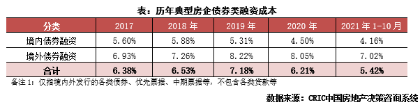 融資成本:2021年截至10月100家典型房企新增債券類1融資成本5.42%,較2020年下降0.79個(gè)百分點(diǎn),其中境外債券融資成本達(dá)7.02%,下降1.03個(gè)百分點(diǎn),境內(nèi)債券融資成本4.16%,較2020年下降0.34個(gè)百分點(diǎn)。單月來看,10月房企融資成本5.68%,環(huán)比上升0.06個(gè)百分點(diǎn),同比下降0.46個(gè)百分點(diǎn)。其中境外融資成本11.75%,環(huán)比上升3.66個(gè)百分點(diǎn),增長較大;境內(nèi)融資成本3.48%,環(huán)比下降0.01個(gè)百分點(diǎn)。房企融資利率在2.90%-14.20%間,境內(nèi)發(fā)行債券有金茂、綠城、華僑城等企業(yè)發(fā)行,利率基本在4%以下,而境外發(fā)債的企業(yè)債券發(fā)行融資成本最高達(dá)14.20%,企業(yè)融資持續(xù)分化。