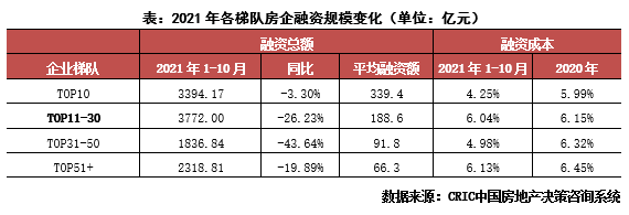 企業(yè)表現(xiàn):本月融資總量最高的企業(yè)為招商蛇口,融資總量約87.5億元,主要是向境外銀行申請(qǐng)了20億港元的貸款和為多家子公司進(jìn)行了擔(dān)保。從企業(yè)梯隊(duì)來看,2021年1-10月平均額最大為TOP10房企,平均融資額339.4億元,融資總額微降3.3%;TOP31-50梯隊(duì)融資總額同比降幅最大,降幅達(dá)到43.64%。成本來看,4個(gè)梯隊(duì)均較2020年全年下降,其中TOP10梯隊(duì)的融資成本最低,為4.25%,下降幅度為1.74pct,降幅最大。