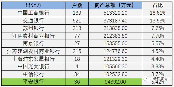 經整理,發現共有32家銀行的交易記錄,其中出讓金額最大的是工商銀行,達到51.33億元;出讓戶數最多的是交通銀行,共有521戶。上表所示前十大銀行全年共出讓資產金額為201.49億元,占比超過七成。所以,雖然市場供應方增加但出讓資產仍比較集中。