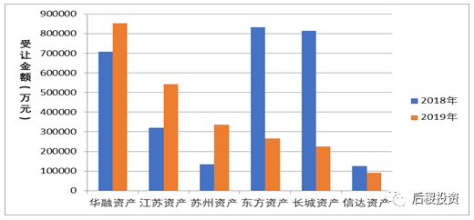 相比2018年,東方資產和長城資產受讓銀行資產總額下滑顯著,跌出前二。華融資產受讓85億資產位列首席,江蘇資產、蘇州資產緊隨其后,位于二三位。