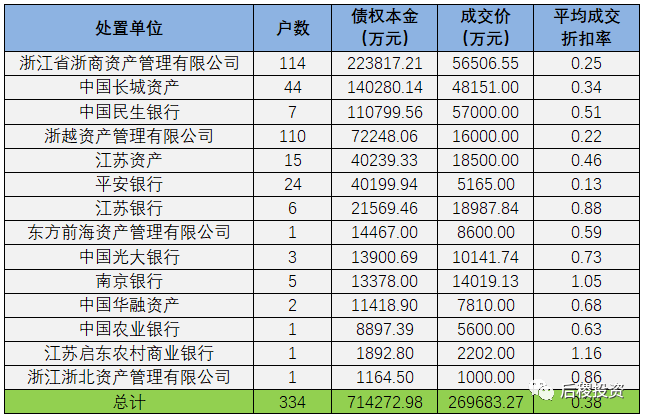 從阿里拍賣平臺中篩選出江蘇地區債權(超過1000萬)成交記錄,總成交戶數334戶,成交債權總本金超71.4億,總成交價26.97億元。具體情況如下表所示: