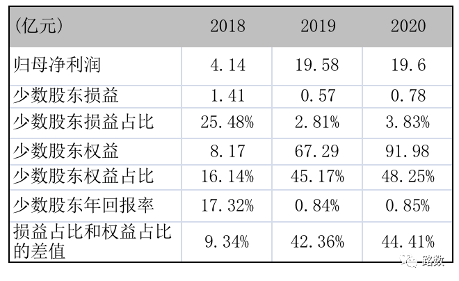 少數(shù)股東權(quán)益占比,過往三年逐年攀升,但相應(yīng)少數(shù)股東的損益沒有同比增長。與此同時,少數(shù)股東權(quán)益占比與損益占比的差值逐漸擴大,且少數(shù)股東年回報率下降明顯。