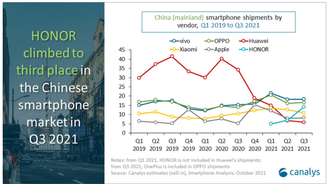 國內智能手機市場方面,榮耀在2021年第三季度超越小米,躍升為國內市場份額的第三名。同時,在前五名企業中,小米的出貨量增速排名墊底,公司國內市場的頹勢初顯。