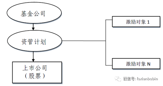 該模式主要通過基金公司或資產管理公司設立資產管理計劃投資擬實施員工持股計劃的上市公司的股票,其中以“康源藥業員工持股方案”為典型;或者通過基金公司下設的子公司設立專項資產管理計劃投資擬實施員工持股計劃的非上市公司的股份,其中以“民生電商員工持股方案”為典型。具體模式如圖所示: