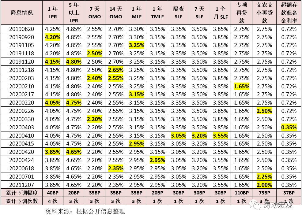 (一)自2019年8月推出LPR新報價機制以來,央行調降將近30次包括LPR在內的相關政策利率,具體來看1年期LPR調降4次、5年期LPR調降3次、7天OMO利率調降3次、14天OMO利率調降3次、1年期MLF利率調降3次、1年期TMLF利率調降1次、各期限SLF利率分別調降1次、1年期專項再貸款利率調降1次、支農支小再貸款利率調降3次、再貼現利率調降1次、金融穩定再貸款利率調降1次以及超額存款準備金利率調降1次。