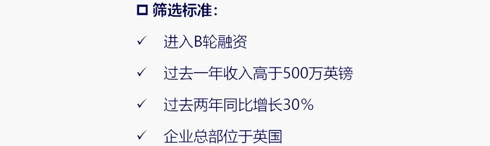 成長企業:進入該階段的企業會進入「未來五十」計劃階段,未來五十指:扶持在英國進入B輪融資發展最快的50家科創企業,英國政府每年為企業量身定制扶植計劃,幫助其發展。