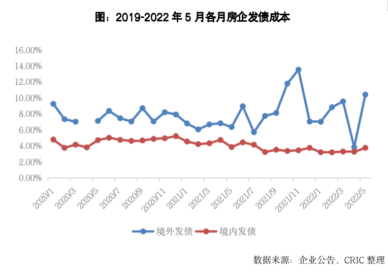 2022年5月100家典型房企新增債券類融資成本4.81%,環(huán)比上升1.55pct,同比下降0.4pct。其中境內融資成本3.73%,環(huán)比上升0.5pct,發(fā)債主體仍是集中在中海、保利發(fā)展、華潤置地等國企央企;境外融資成本為10.38%,環(huán)比大幅提升了6.58pct,主要是因為上個月僅有遠洋集團發(fā)行了一筆成本較低的綠色債券,而本月則有中梁和大唐因為交換要約發(fā)行了3筆優(yōu)先票據(jù),融資成本都相對較高。2022年截至5月100家典型房企新增債券類融資成本4.39%,較2021年全年下降0.89個百分點,其中境外債券融資成本7.98%,較2021年全年上升0.96個百分點,境內債券融資成本3.35%,較2021年全年下降0.71個百分點。
