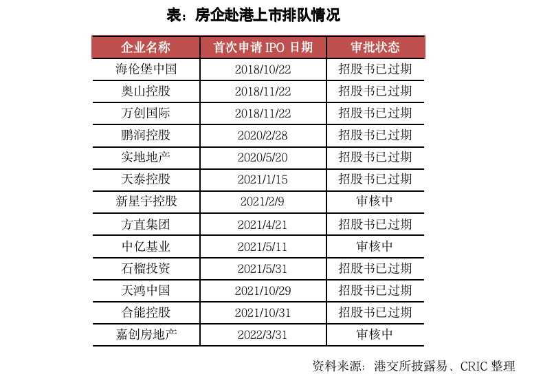 本月沒有新增房企遞交上市申請,因此截至2022年5月底,在港交所在遞交過招股書但仍未成功上市的房企為13家,其中有10家房企在招股書過期后都沒有更新招股書,未來是否會繼續(xù)上市進程還有待觀察。