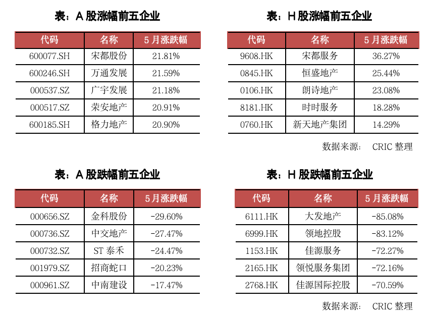 本月兩市的地產相關股表現(xiàn)都較為一般。A股地產股整月上漲的股票占比為56%,而H股整月上漲的股票占比則僅為26%。在H股方面,本月宋都服務的月漲幅達到了36.27%,是H股漲幅最大的地產相關股。企業(yè)從5月4日開始連續(xù)大漲,在11日甚至達到了近20%的漲幅,奠定了整月漲幅的基礎,此后雖然股價略有波動,但是整月最終的漲幅仍然達到了36.27%。