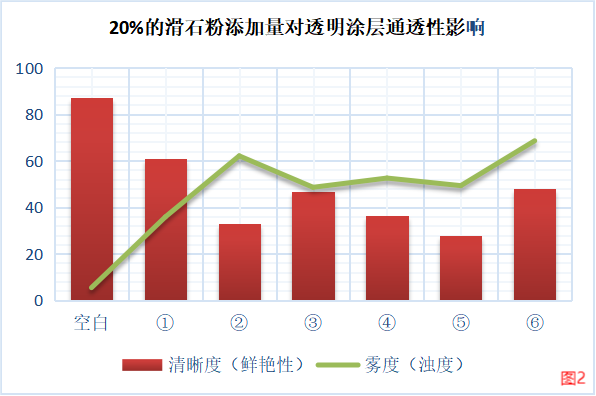 綜上①滑石粉具有明顯優(yōu)異于其他滑石粉的透明性,同時(shí)在高比例下仍可保持較優(yōu)異的清晰度和低霧度,可見①滑石粉為透明級(jí)滑石粉,比一般滑石粉更適用于如木器涂料的透明體系中。