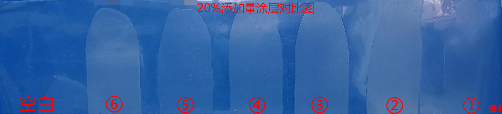 同時(shí)使用霧度儀ASTM標(biāo)準(zhǔn),測(cè)試400-700nm波長(zhǎng)下,添加20%滑石粉涂層的霧度(濁度)和清晰度(鮮艷性)如上圖2,①滑石粉在20%添加比例下仍可以保持較好的清晰度,對(duì)涂層的濁度外觀影響較?。徽w的外觀情況如下圖3。